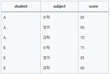 SELECT student, MAX(IF(subject = "수학", score, NULL)) AS 수학, MAX(IF(subject = "영어", score, NULL)) AS 영어, MAX(IF(subject = "과학", score, NULL)) AS 과학 FROM table GROUP BY student↓
