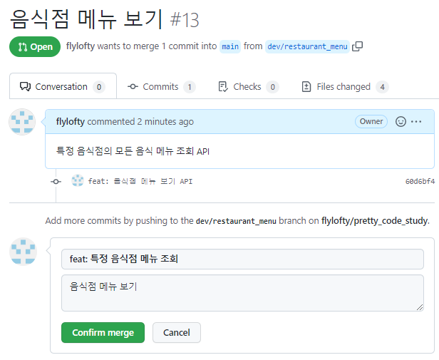 그리고 dev 브랜치로 switch 하고 feature 브랜치를 Merge 이후 리모트로 푸시! 혹시나 틀리면 bash가 힌트를 줄 것이다. 병합된 feature 브랜치는 꼭 삭제하자!