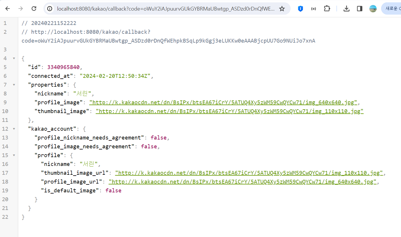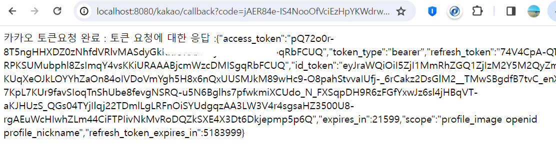 return "카카오 토큰요청 완료 : 토큰 요청에 대한 응답 :" + response.getBody();
