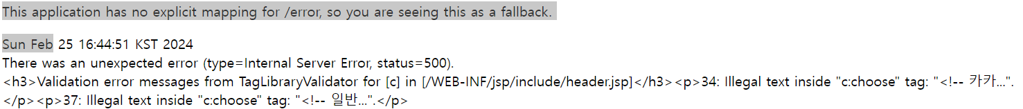 <h3>Validation error messages from TagLibraryValidator for [c] in [/WEB-INF/jsp/include/header.jsp]</h3><p>34: Illegal text inside "c:choose" tag: "<!-- 카카...".</p><p>37: Illegal text inside "c:choose" tag: "<!-- 일반...".</p>