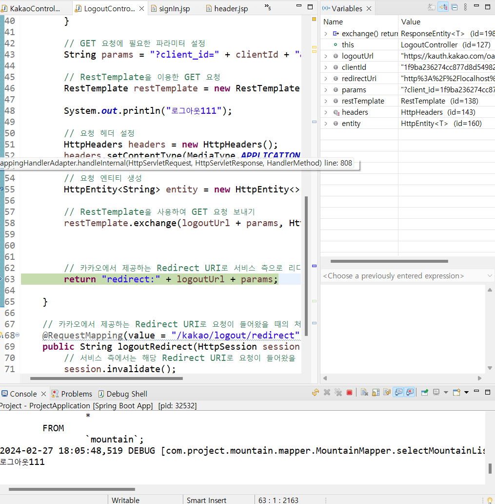 먼저 LogoutController의 logout메소드에서 실행을 해봤다