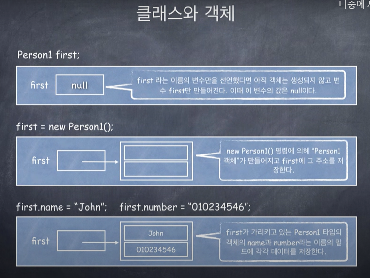 이름과 전화번호를 저장할 Person1 object는 new명령으로 따로 만들어야 하고 변수 first에는 그 객체의 주소(참조)를 저장할 수 있다