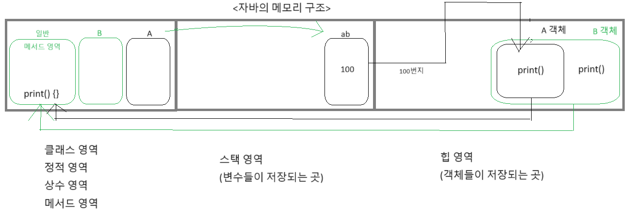 A ab = new B();로 객체 생성하고, print()메서드를 호출 했을 때의 메모리 구조