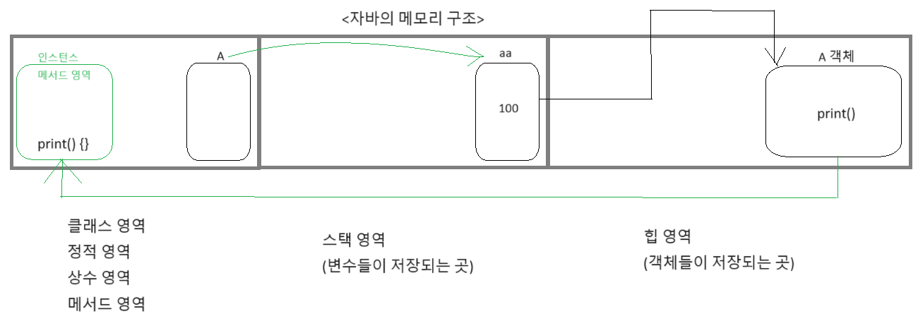 A aa = new A();로 객체를 생성하고 print()메서드를 호출 했을 때 메모리에서 일어나는 일