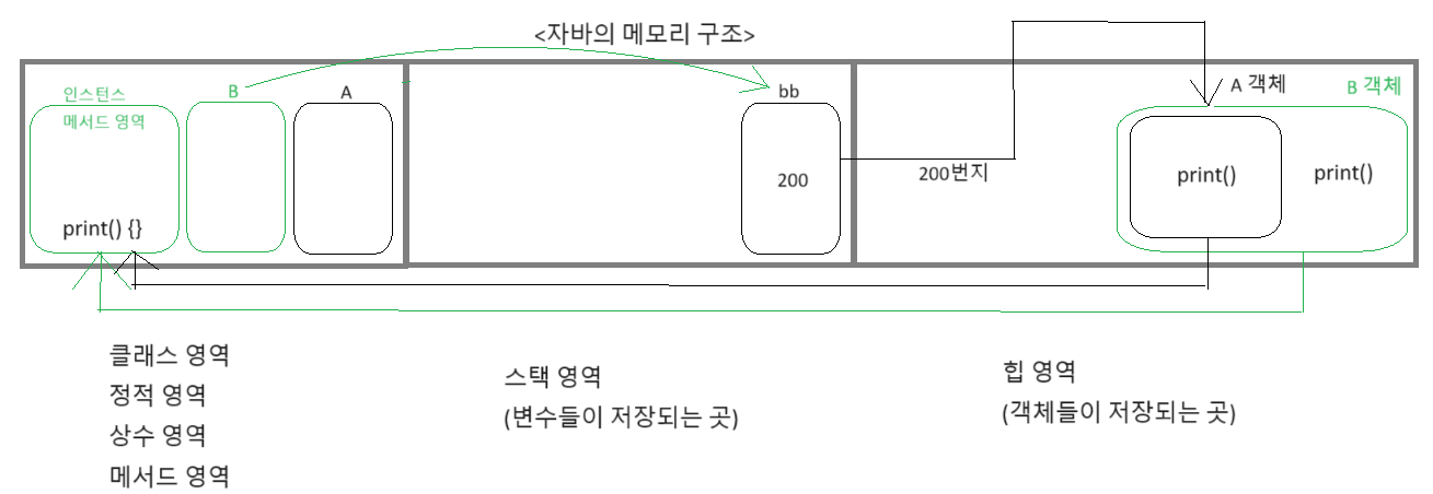bb.print()를 실행하면 bb객체 내부의 print() 메서드가 가리키는 곳에 가서 print() 메서드가 실행되므로 "B 클래스" 가 출력된다.