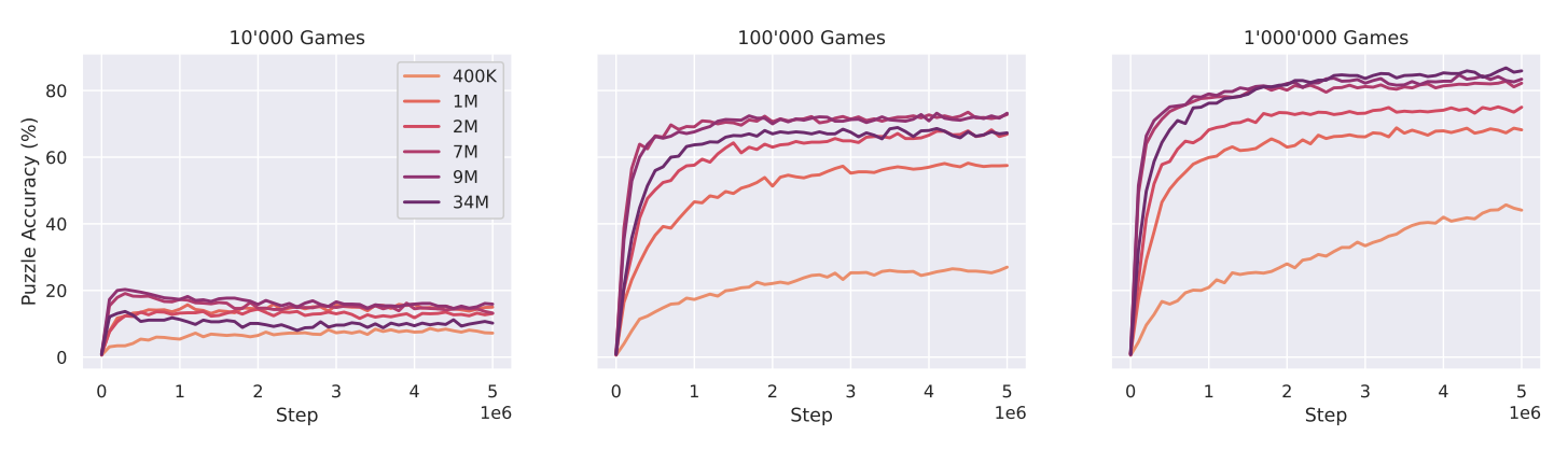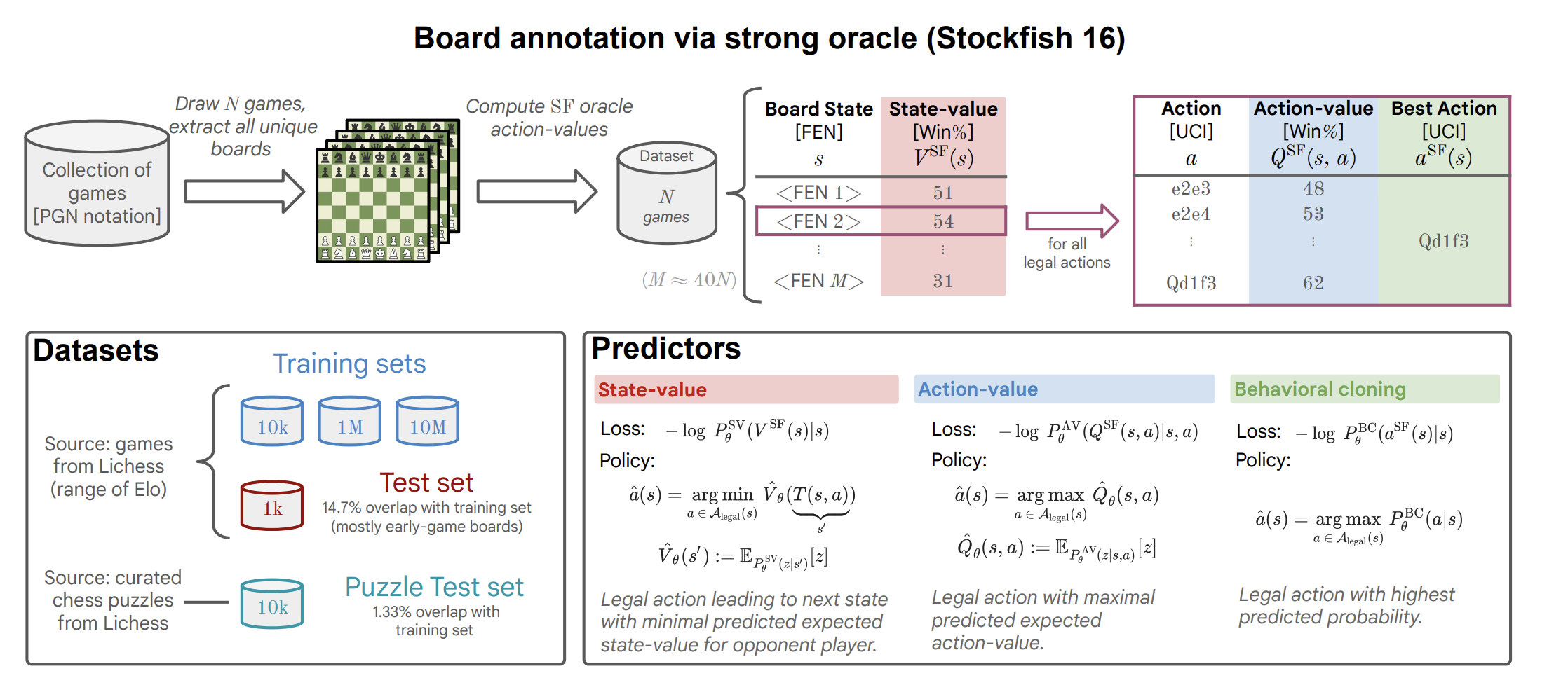 - 본 논문에서는 (1) 1천만 개의 chess game datasets을 이용하여 (2) 2억 7천만 parameter를 가지는 transformer model로 지도 학습을 진행함