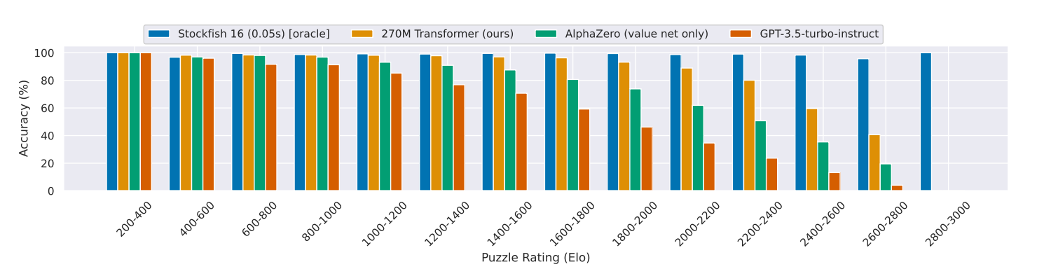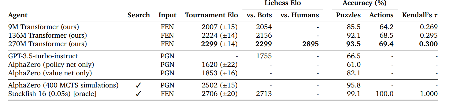 - 인간 player 대랑 Lichess blitz Elo는 2895에 이르고, search 없이도 성공적인 chess play가 가능함