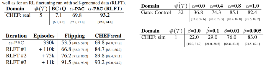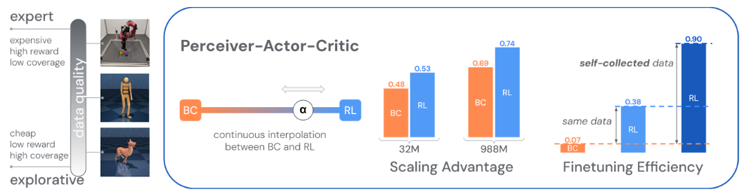 Imitation learning 분야인 Behavior cloning (주어진 데이터셋을 기반으로 학습)도 위 사례와 유사하게, 규모의 확장을 통해 Multi-task 학습 성능이 엄청 증가했다고 함