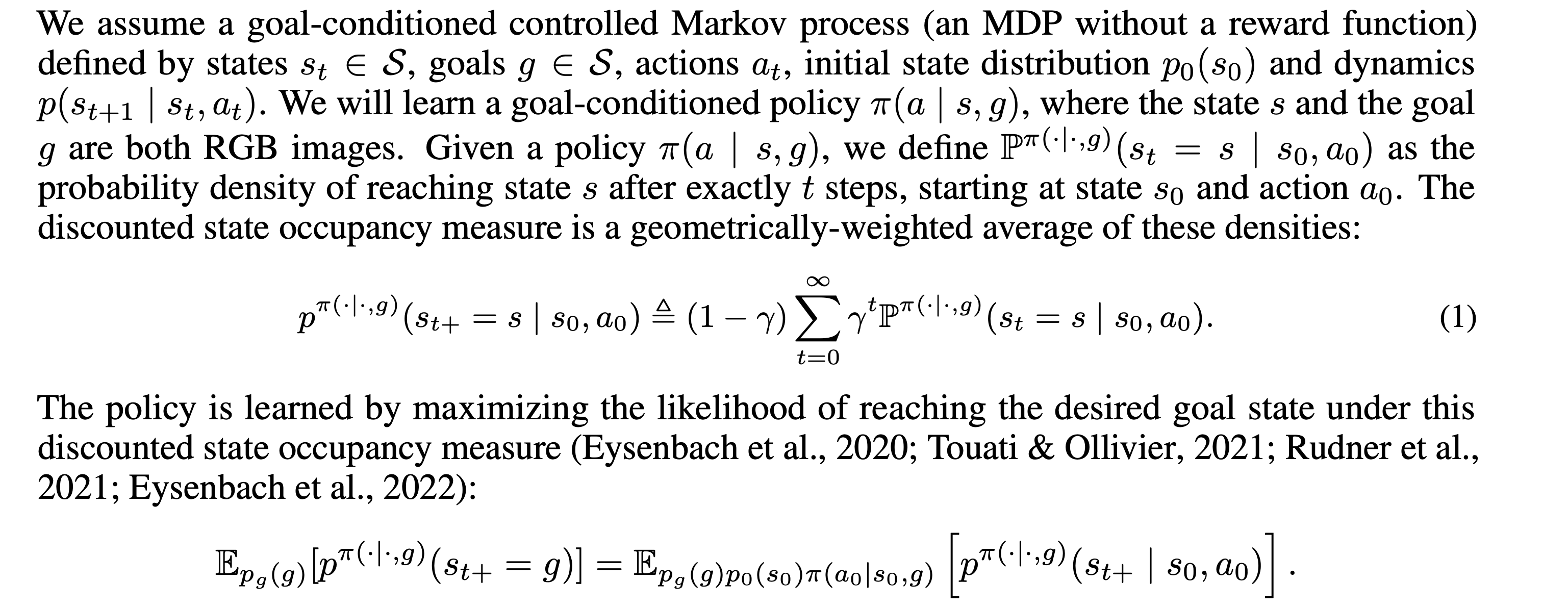 - SSL+RL 기반의 이전 연구들에서는 contrastive learning objective로 (1) compact representations (2) a goal-conditioned policy (3) corresponding value function을 동시에 학습했음 (Eysenbach et al., 2022)
