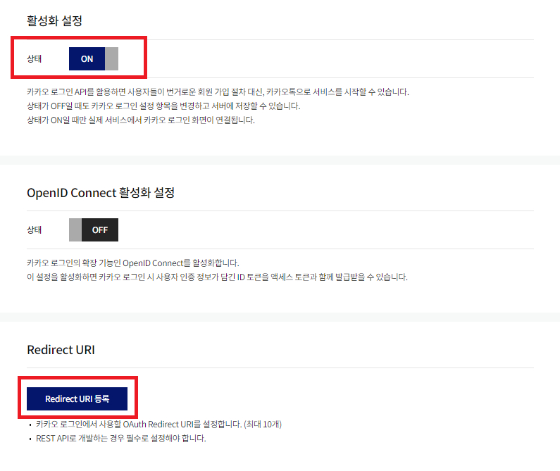를 이용할때 만들어놨으니 카카오 로그인 기능 활성화, Redirect URI