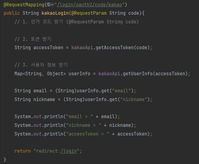 파라미터로 인가 코드를 받아주고 이 코드를 로그인 후의 페이지에 넘겨주었다.
