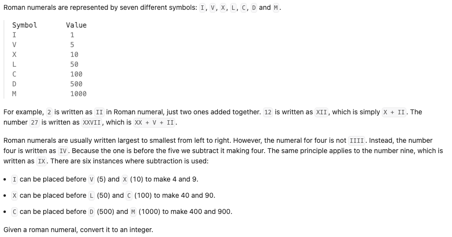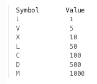 해당 문제 설명이다. 로마 숫자는 7가지 기호로 표시됩니다. (I, V, X, L, C, D 및 M)