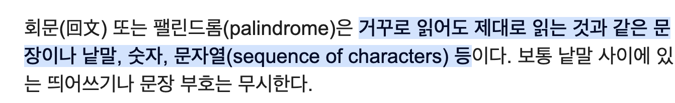 먼저 회문이란 설명과 같이 거꾸로 읽어도 제대로 읽는 것과 같은 문장이나 숫자, 문자열을 말한다.