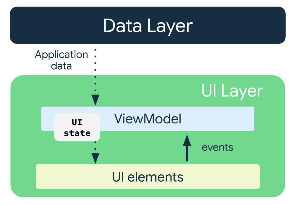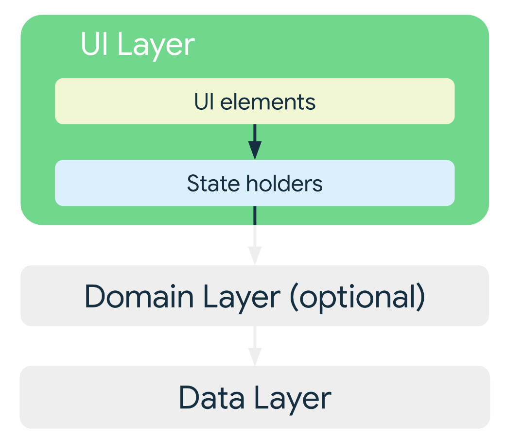 UI elements : 화면에 데이터를 렌더링 하는 UI 요소 → 뷰 !State holders : 데이터를 보유하고 이를 UI에 노출하며 로직 처리하는 상태 홀더 → 뷰 모델 !UI : 사용하는 API(뷰 or Jetpack Compose)와 관계없이 데이터를 표시하는 활동 및 프래그먼트와 같은 UI 요소