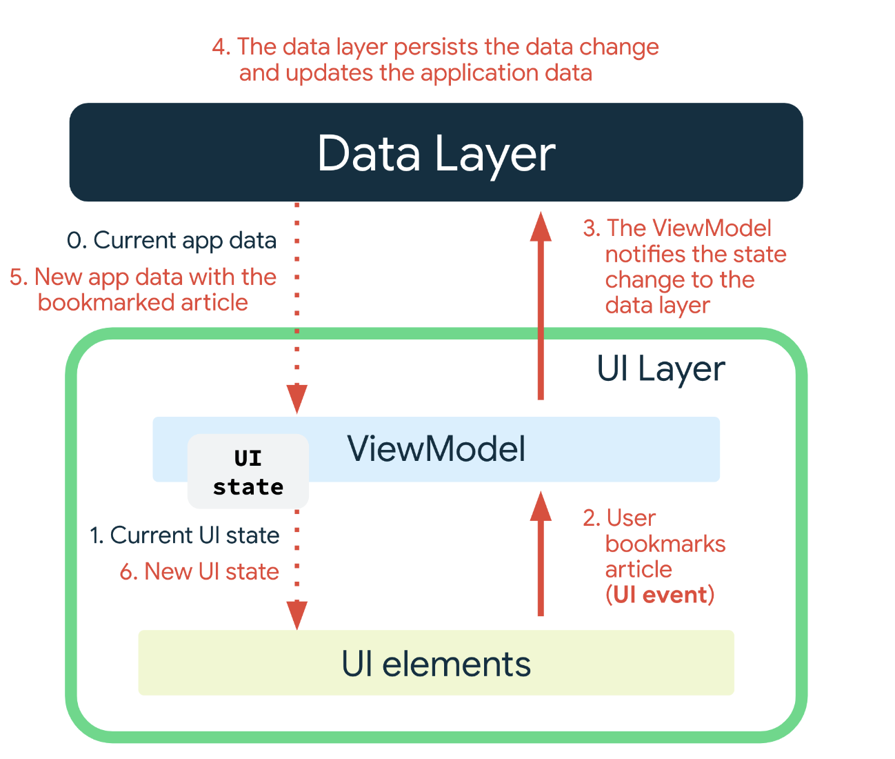 ViewModel 이 Data Layer 에서 현재의 앱 데이터 가져옴 (여기서는 이미지 / 타이틀 / 작성자 / 작성 시간 / 북마크 체크 여부)View 에서 현재의 UI State 를 옵저빙해서 UI 요소에 적용View 에서 북마크를 해제했을 때(UI 이벤트 발생) ViewModel 에게 알림 (여기서 알린다는 뜻은 ViewModel 이 View 를 참조하고 있다는 것이 아닌, View 에서 ViewModel 의 메서드를 호출함. 즉, MVVM 패턴에서 “ViewModel 은 View 를 몰라야 한다” 라는 것에 위배되지 않음)ViewModel 은 Data Layer 에게 데이터 수정을 요청함Data Layer 에서는 data를 업데이트하고, 앱 데이터를 수정함ViewModel 에서는 새로운 데이터를 받아옴데이터 일관성 : UI 용 정보 소스가 하나 → SSOT테스트 가능성 : 상태가 분리되어 있어 UI 와 별개로 테스트 가능유지 관리성 : 상태 변화가 일관된 방식으로 처리되어 코드를 쉽게 수정, 이해, 확장할 수 있음LiveDataStateFlow→ 관찰 가능한 데이터 홀더에 UI 상태 노출