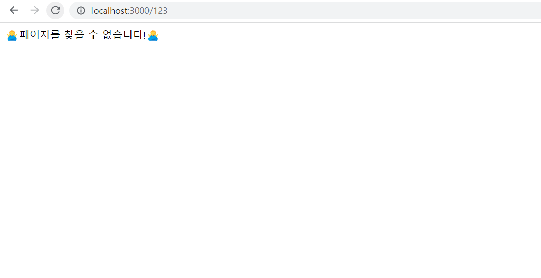 마찬가지로 경로를 이탈했을 때, '페이지를 찾을 수 없습니다!'가 나오는 것을 확인할 수 있었다. 사진이 보이지 않는 이유는 html파일을 템플릿 레터럴을 활용해 변수로 지정했는데, 그 과정에서 사진이 정상적으로 출력되지 않았던 것 같다.