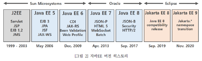 2010년 Sun이 Oracle에 인수되면서 Oracle이 Java EE 개발을 주도했지만 2017년 Java EE 8이 마지막 버전이 되었다.