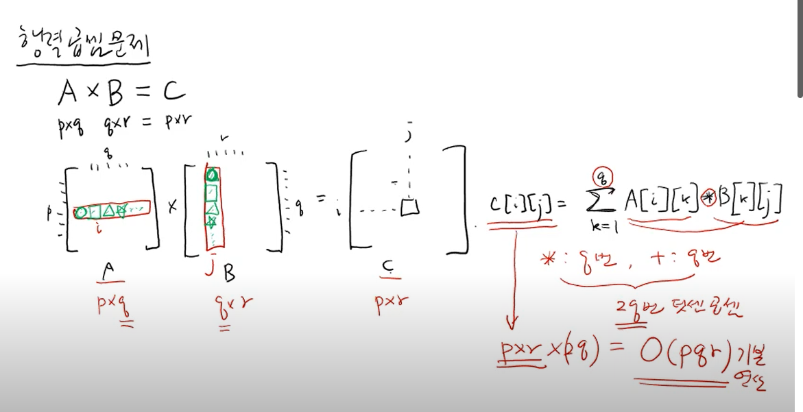 그 이유는 행렬곱의 결과인 C 행렬이 p x r의 크기이고, C의 성분(entry)인 C[i][j]가 행렬 A의 p행과 행렬 B의 r열의 곱(*)으로 q번만큼 더해지기(+) 때문에