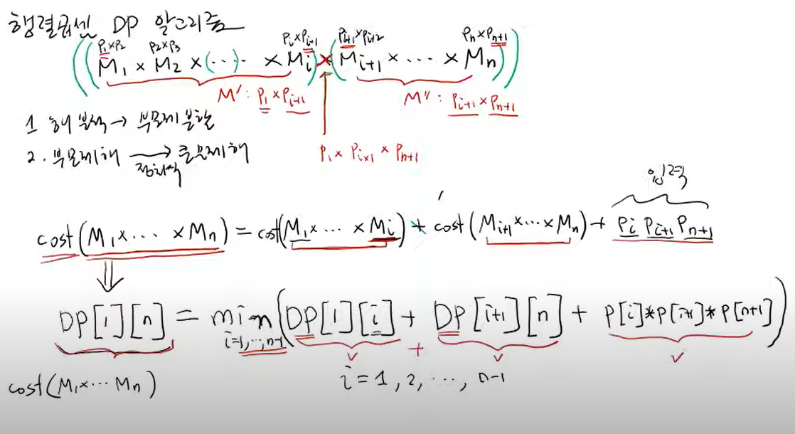 즉, cost(M1 x M2 x ... Mn) = cost(M1 x ... Mi) + cost(Mi+1 x ... x mn) + Pi x Pi+1 x Pn+1 의 값을 구하면 됩니다.