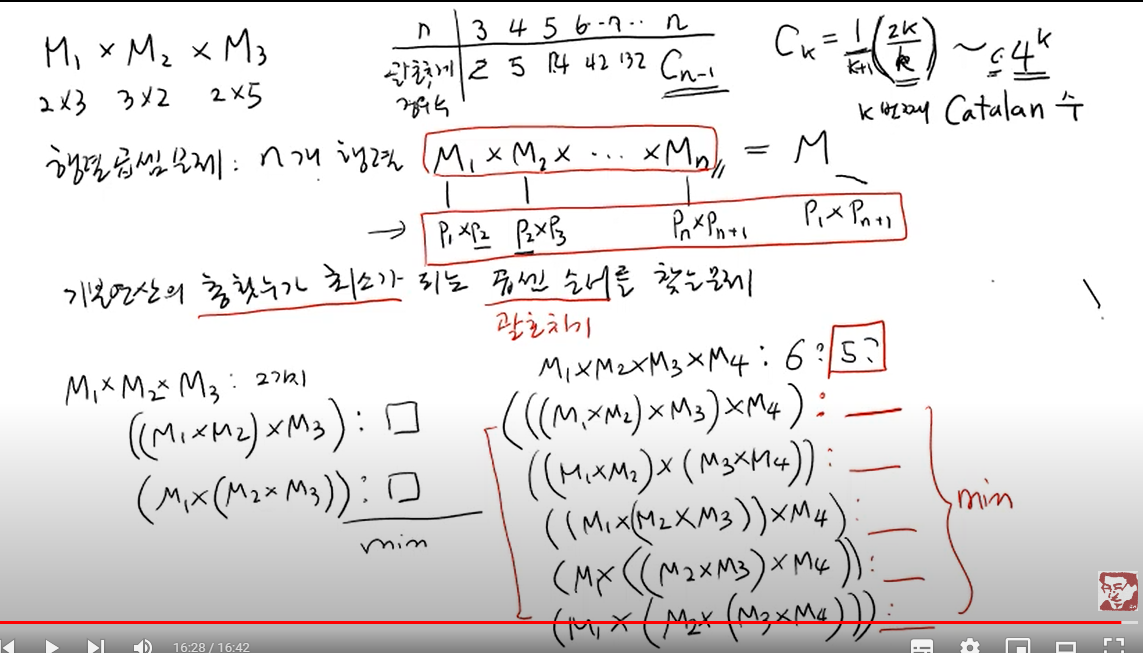 그러나, 행렬이 4개로 늘어나면 괄호치는 경우의 수는 5개, 5개일 땐 14개, 6개일 땐 42개 ...로 기하급수적으로 늘어납니다. (이를 catalan 수라고 부릅니다.)