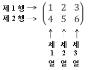 숫자나 문자를 직사각형 모양으로 배열한 후 양쪽을 괄호로 나타낸 것이 행렬(Matrix)입니다. 가로 배열을 행(row)라고 하고, 세로 배열을 열(column)이라고 합니다.
