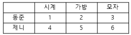 동준이와 제니가 가지고 있는 시계, 가방, 모자의 수를 표로 나타냈습니다.