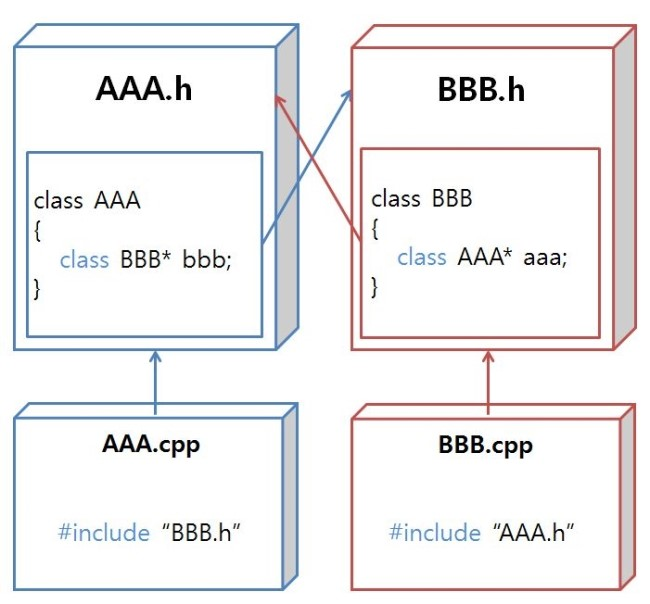 순환 참조란 적게는 두 클래스가 서로를 참조하는 경우를 뜻합니다. 이 경우, 소스 코드에 클래스를 선언하고 있는 헤더를 include하여 해결합니다.