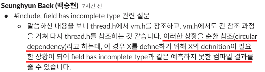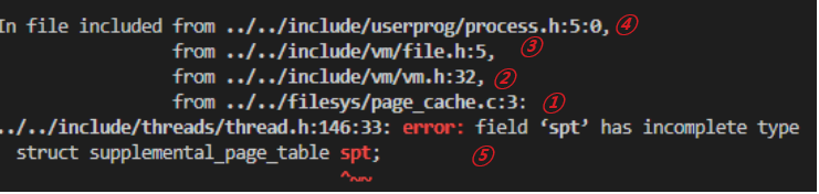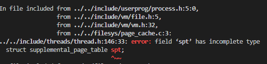 - vm.h에서 spt 구조체는 완전하고, vm.h를 thread.h에 포함(include)했음에도 컴파일러가 불완전한 타입으로 인식한다.