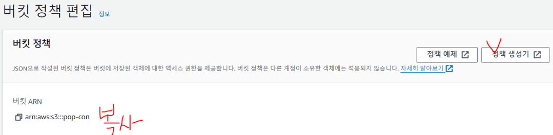 해당하는 Bucket의 권한 - 버킷 정책 - 편집 클릭