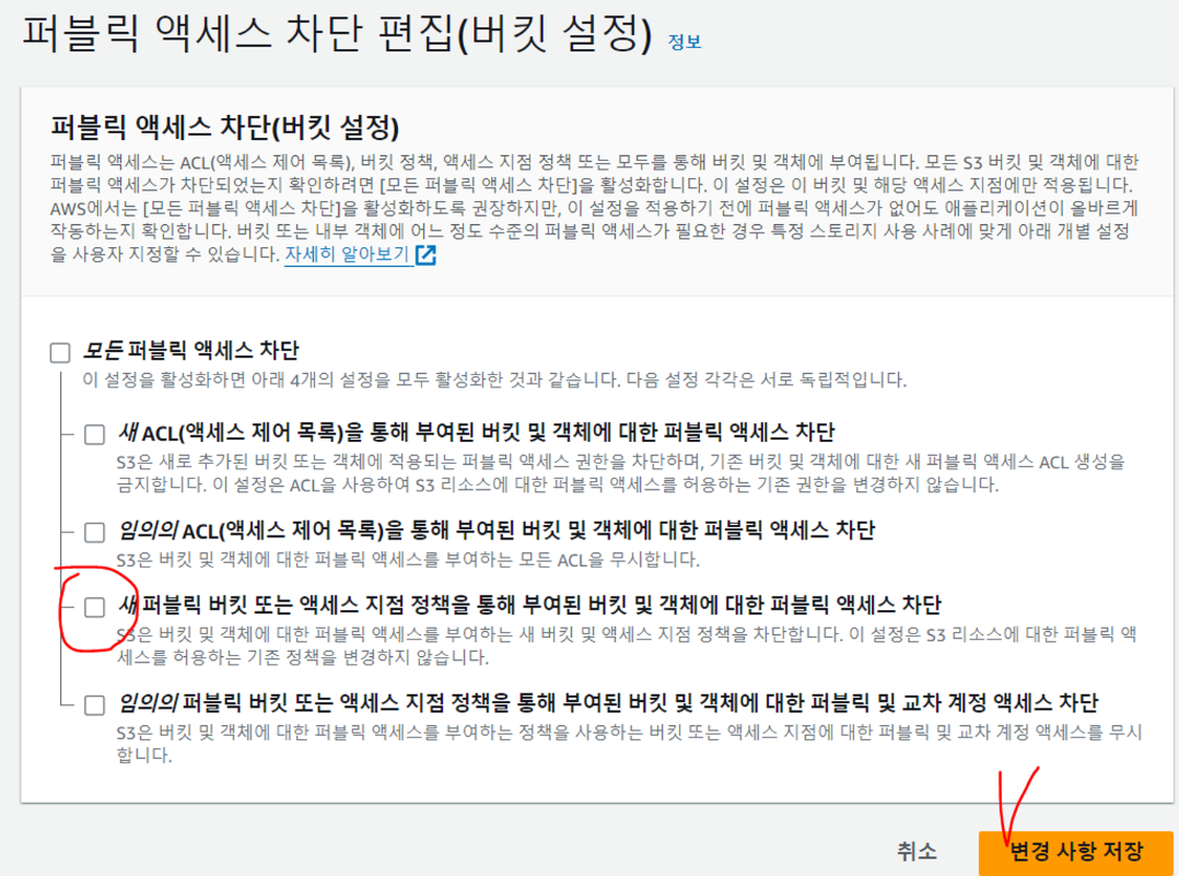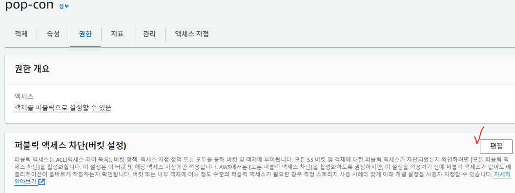 해당하는 Bucket의 권한 - 퍼블릭 액세스 차단(버킷 설정) - 편집 클릭