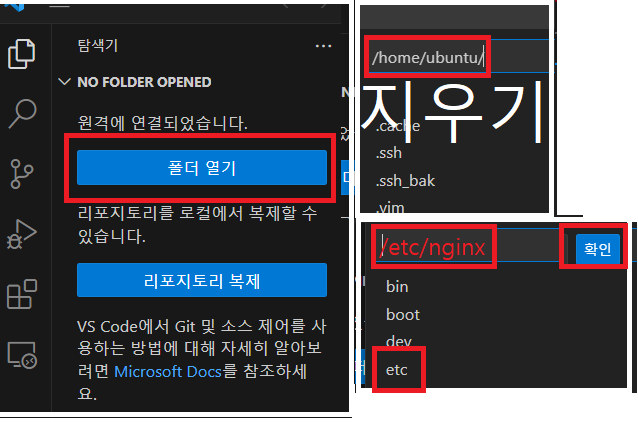 폴더 열기 -> 기본 경로 지우고 -> /etc/nginx 로 확인 하면 nginx 폴더가 열립니다^^