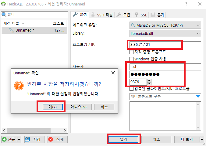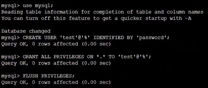 TEST 유저 만들기, 권한설정, 외부에서 접속할 수 있도록 함.