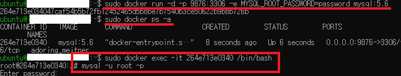 sudo docker run -d -p 9876:3306 -e MYSQL_ROOT_PASSWORD=password mysql:5.6