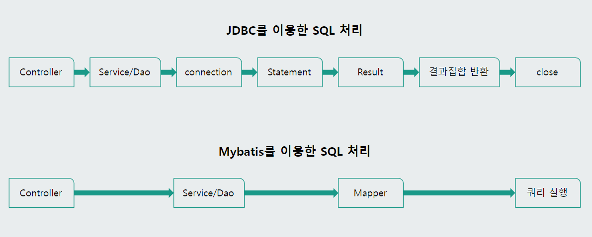 JDBC를 통하여 파라미터를 수동으로 설정하고 결과집합 역시 DTO 객체에 수동으로 저장해줘야 하는 번거로움이 Mybatis에서는 대폭 줄어든다.