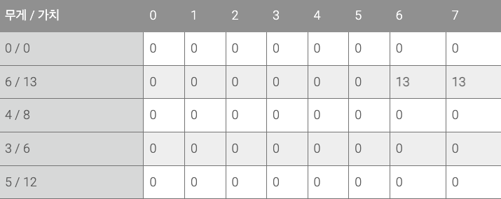 첫 번째 물품은 6kg에 가치가 13이다. 0~5kg 까지는 이 물품을 담을 수 없기 때문에 갱신되지 않고 6kg일 때와 7kg일떄 이 물품을 담아서 13의 가치가 된다.
