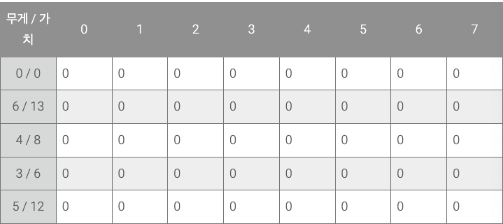 연한 회색으로 나타난 왼쪽의 행 이름은 (무게 / 가치) 를 의미한다.