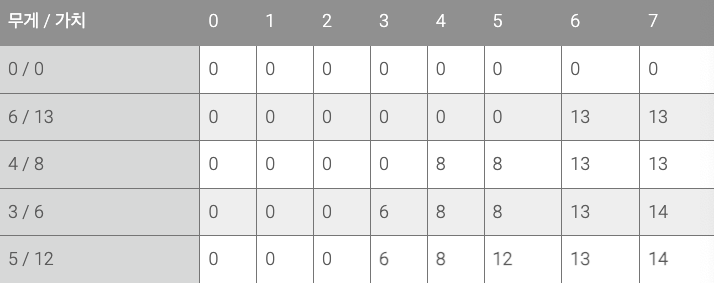 표의 내용은 예를 들어 표의 2행(4 / 8) 3열의 값이 의미하는 것은 그 이전에 등장한 행들(6 / 13)의 경우를 포함해 3kg까지 담을 수 있을 때 얼만큼의 가치를 담을 수 있는지를 저장한다.