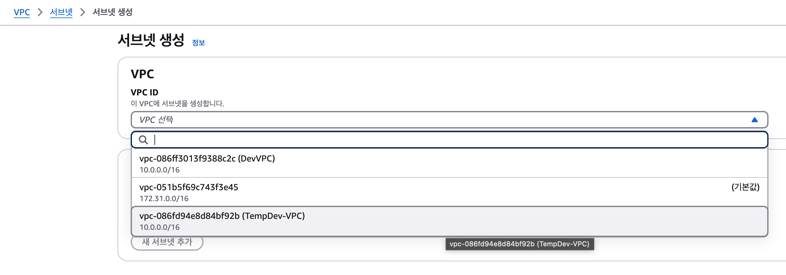 TempDev-VPC10.0.0.0/16 (VPC 내부 네트워크 범위 설정, 기본적으로 넓게 설정)없음 (IPv6 사용하지 않을 경우)기본VPC 내부에서 EC2 인스턴스가 위치할 서브넷을 만들어야 합니다.