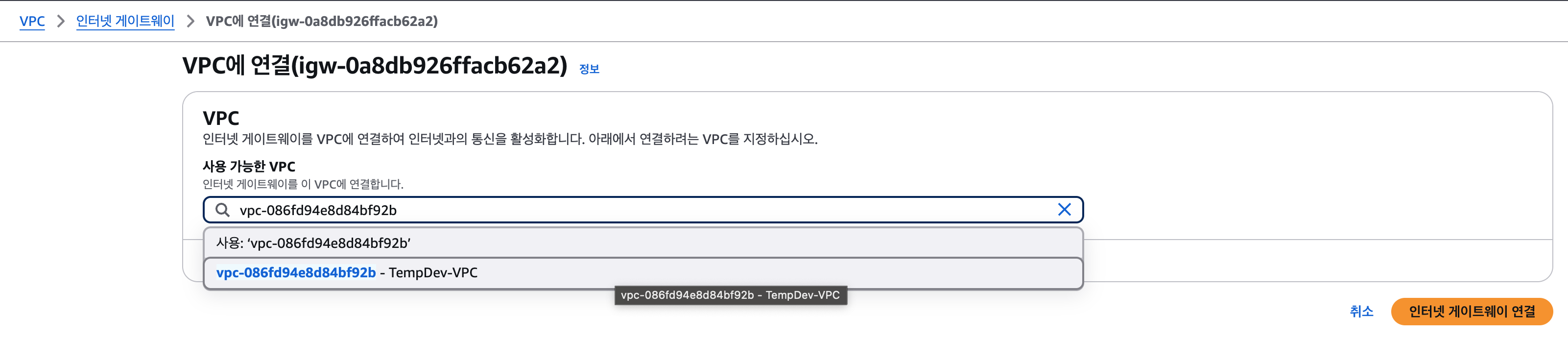 생성 후 "VPC 연결" → TempDev-VPC 선택 → 연결 클릭