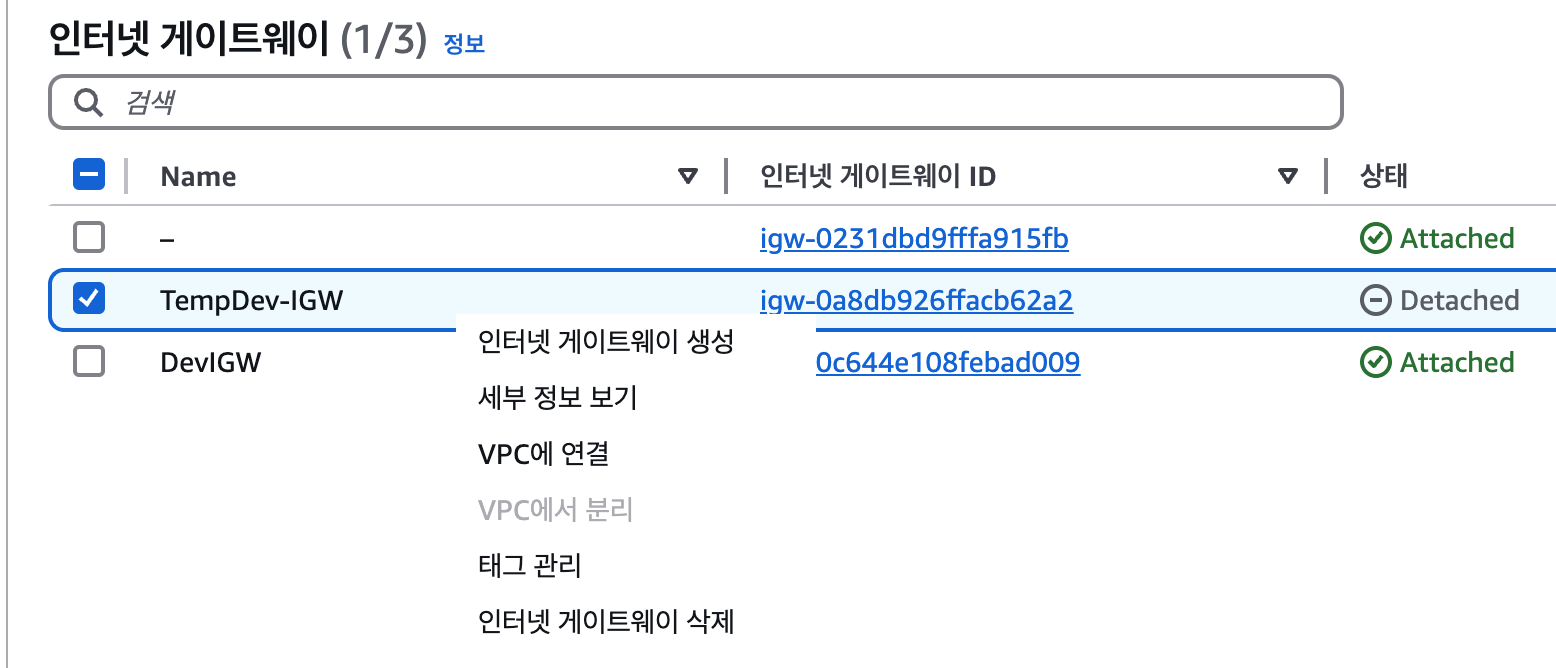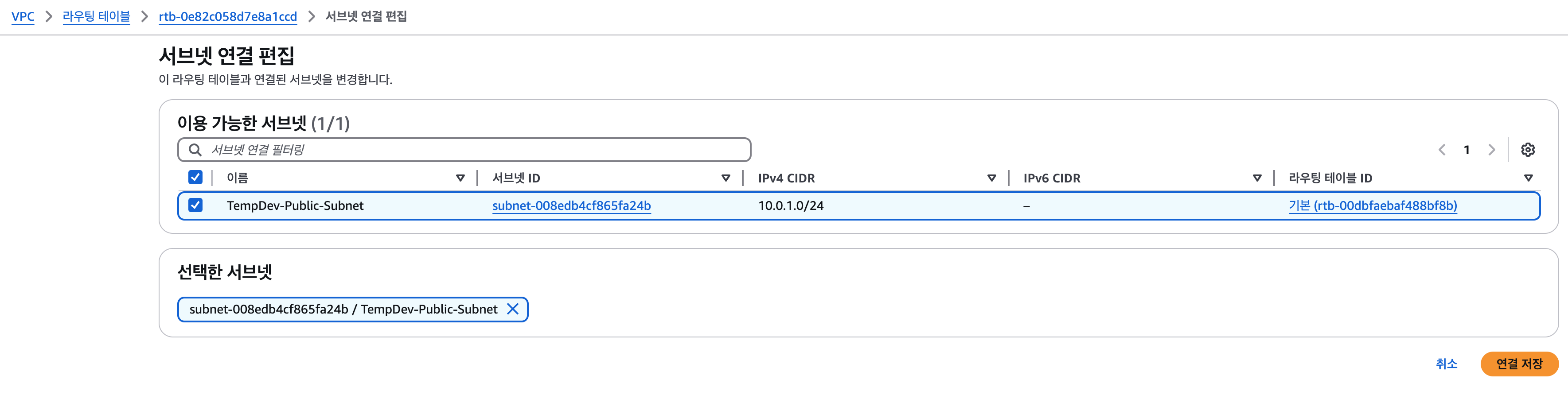 0.0.0.0/0TempDev-IGW하위 네트워크 연결 → TempDev-Public-Subnet 선택 → 연결 클릭