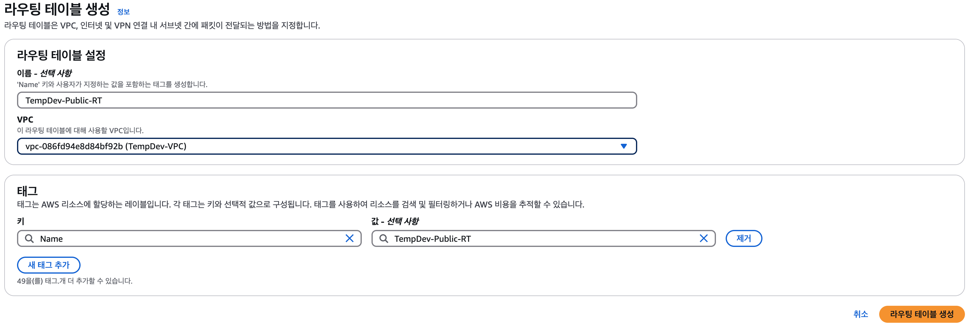 VPC 대시보드 → 라우팅 테이블 → "라우팅 테이블 생성" 클릭