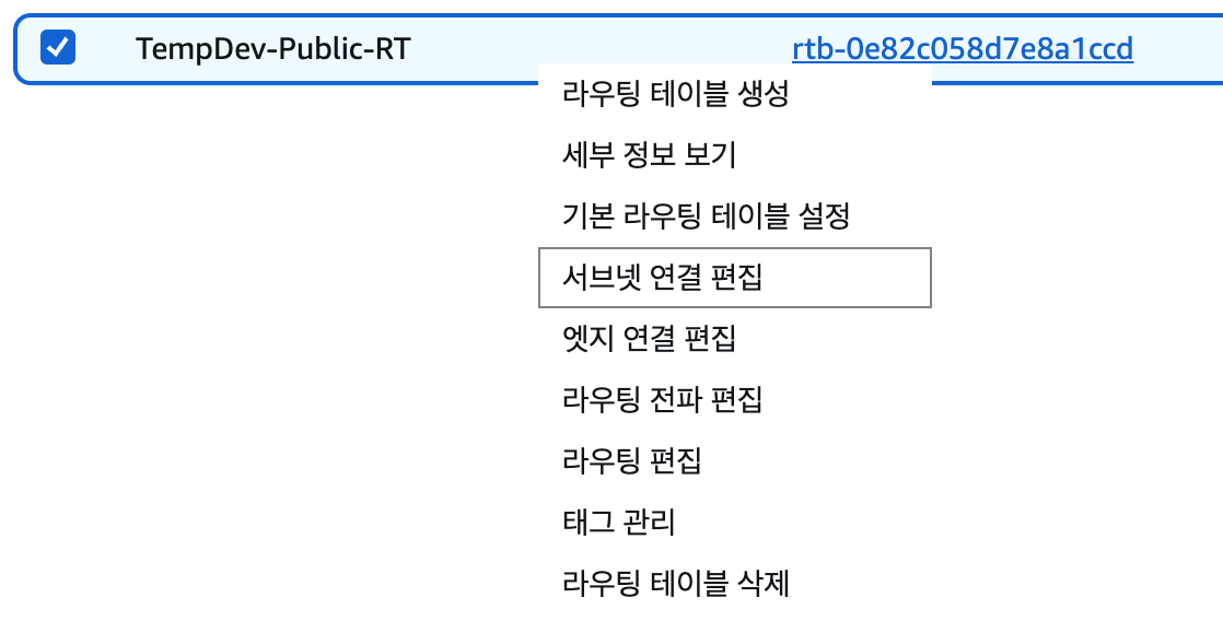 TempDev-Public-RTTempDev-VPC라우팅 테이블 → 경로 편집