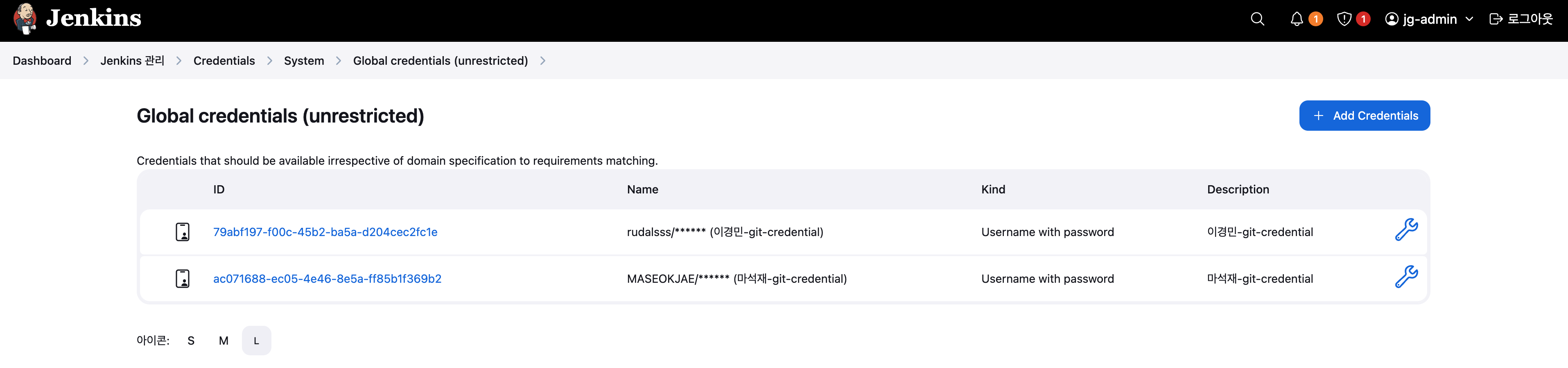 | Jenkins Credentials 설정 | Manage Credentials 확인 |