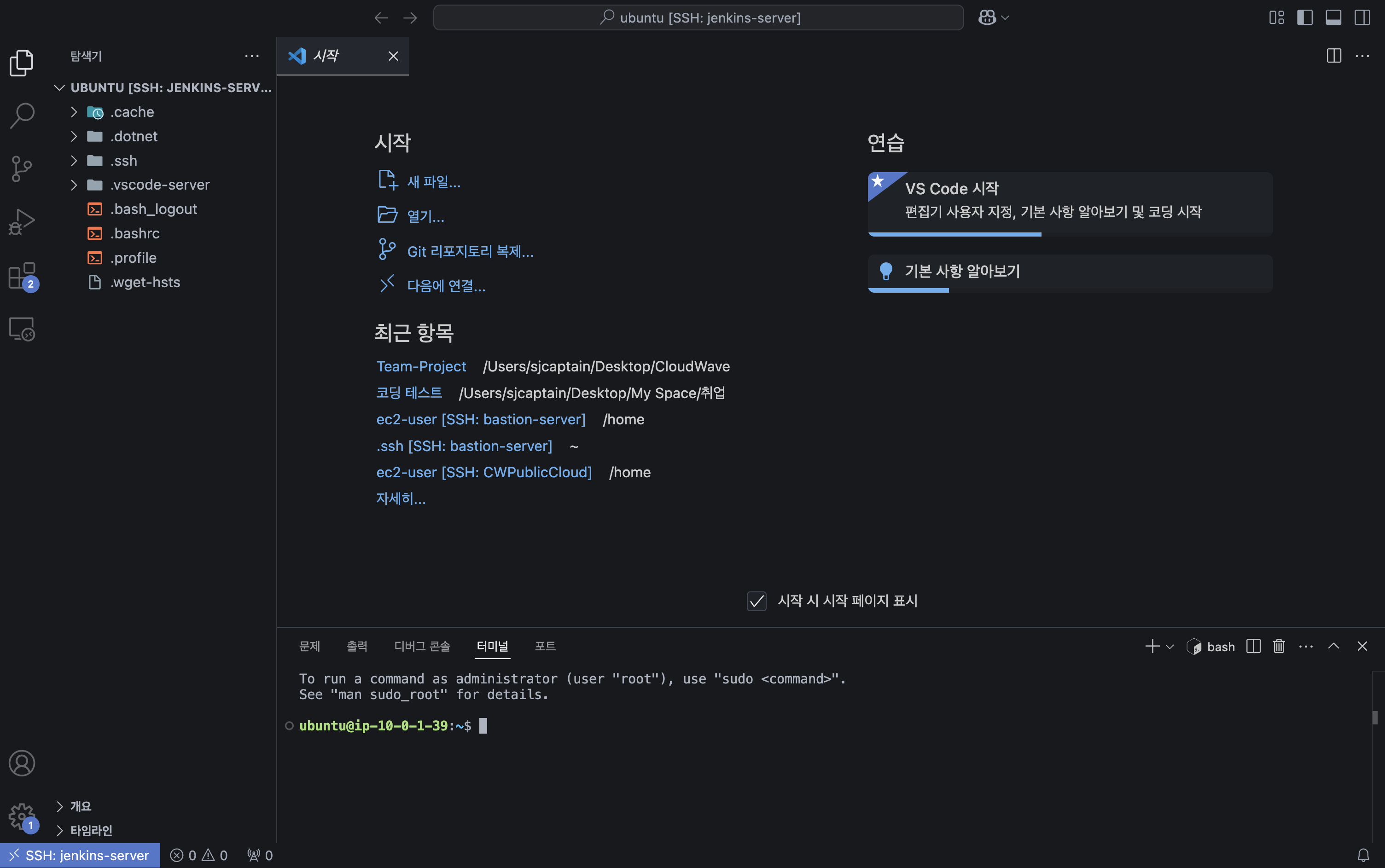 jenkins-server-key.pem (SSH 접속을 위한 키 생성)TempDev-VPCTempDev-Public-Subnet활성화SSH (22) → Anywhere (0.0.0.0/0)HTTP (80) → Anywhere (0.0.0.0/0)HTTPS (443) → Anywhere (0.0.0.0/0)Jenkins (8080) → Anywhere (0.0.0.0/0)EC2 인스턴스를 실행한 후, SSH로 접속하여 기본적인 설정을 진행합니다.
