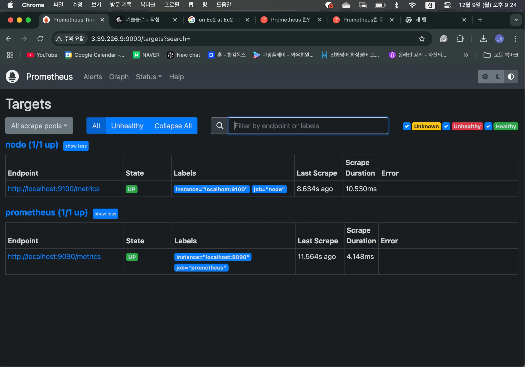 http://localhost:9090/targets로 이동EC2에서 작업할 경우 보안 그룹에서 해당 포트 번호를 인바운드에 추가해야 합니다.