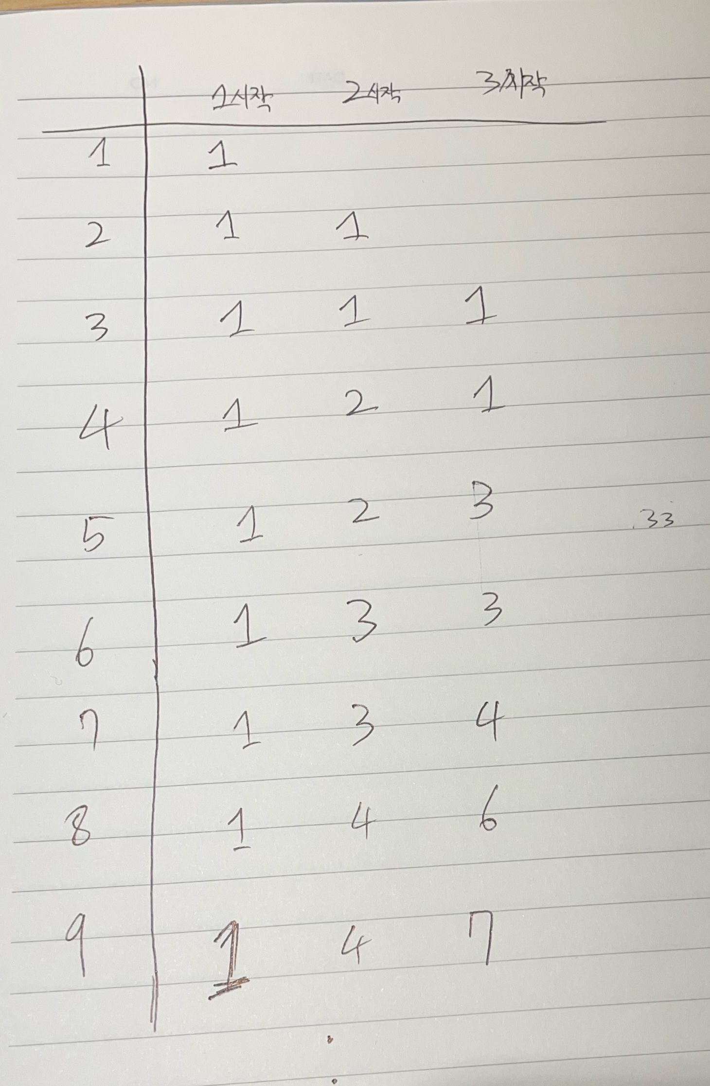 1로 시작하는 경우, 2로 시작하는 경우, 3으로 시작하는 경우로 2차원 배열을 만들어 각각 구해보았다.