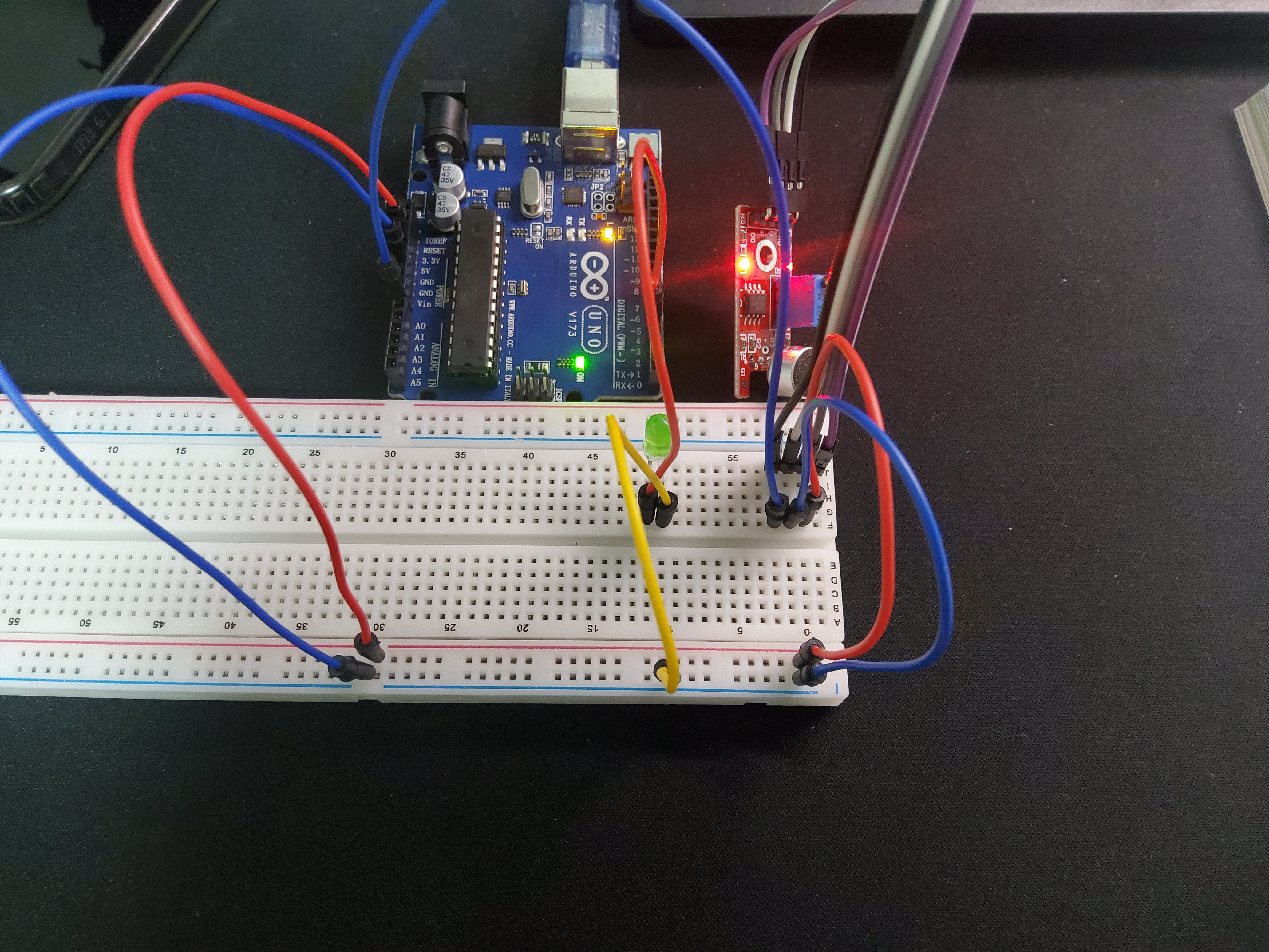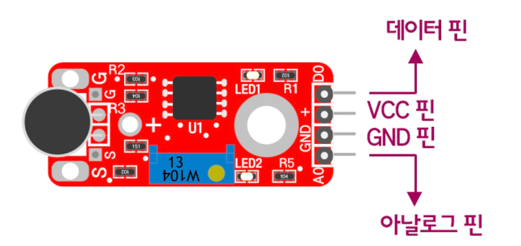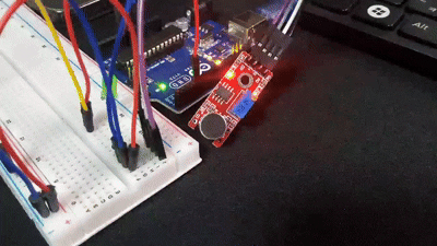 사운드 센서는 장착된 마이크를 통해서 소리의 크기를 아날로그 신호나 디지털 신호로 출력해 줌. 디지털 신호는 소리가 특정 크기 이상일 때 HIGH로 출력됨. 이때 사운드 센서에 내장된 가변 저항을 조절하여 디지털 신호의 소리 크기 기준을 정해줄 수 있음.