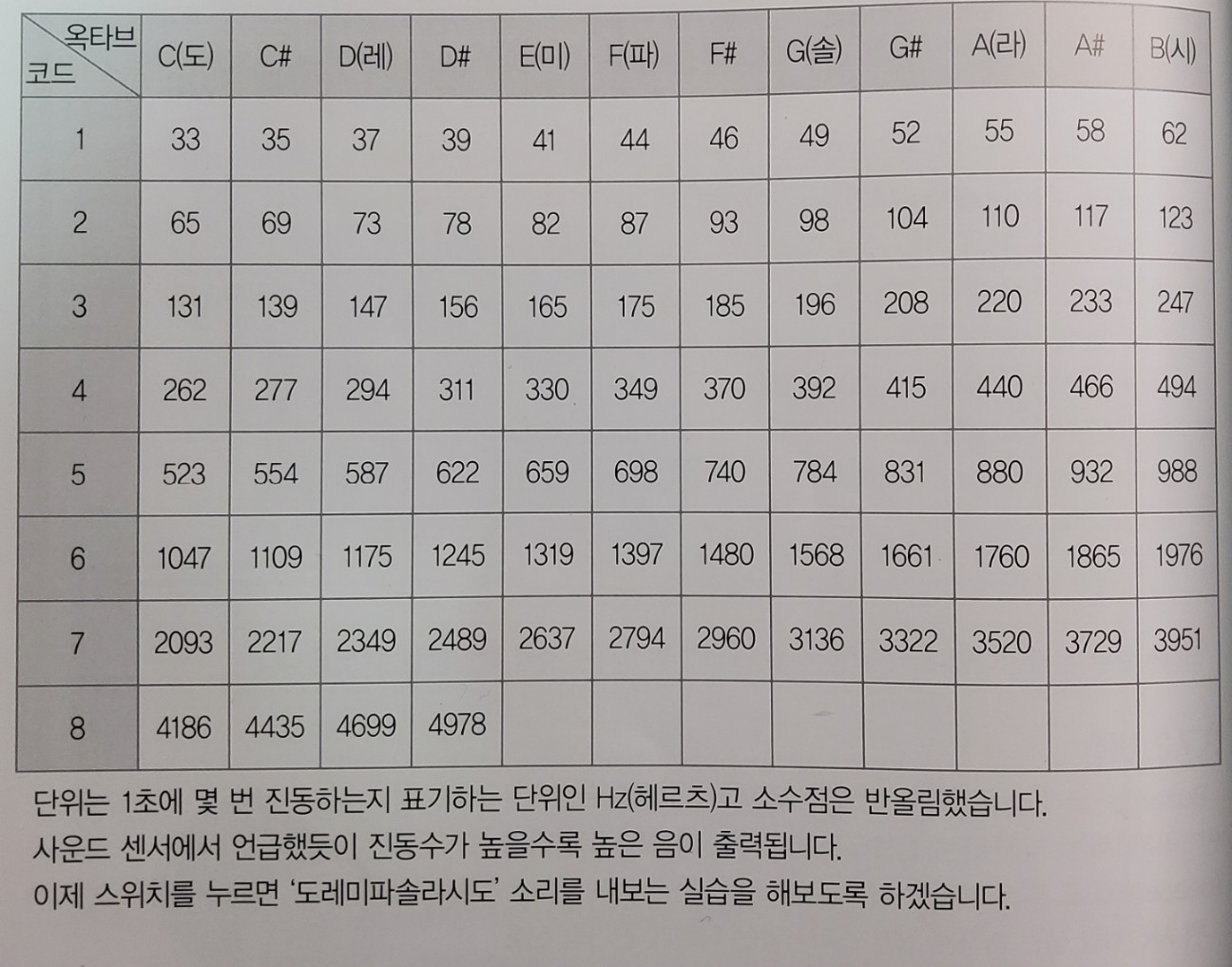 교재에 있는 피에조 부저 표이다.