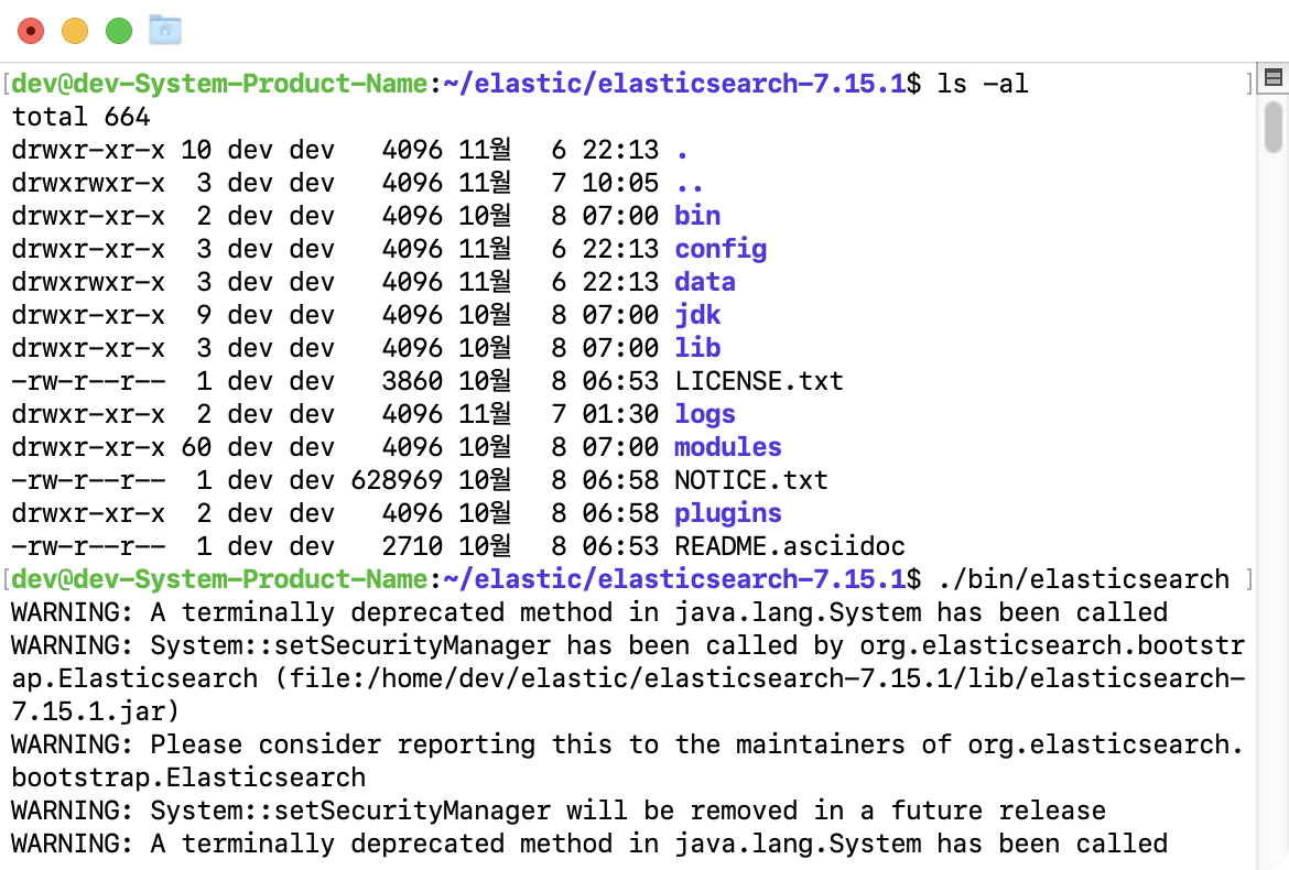 압축을 풀어주고 간단하게 실행 파일을 실행하는 것만으로도 Elasticsearch 프로세스가 시작된다.