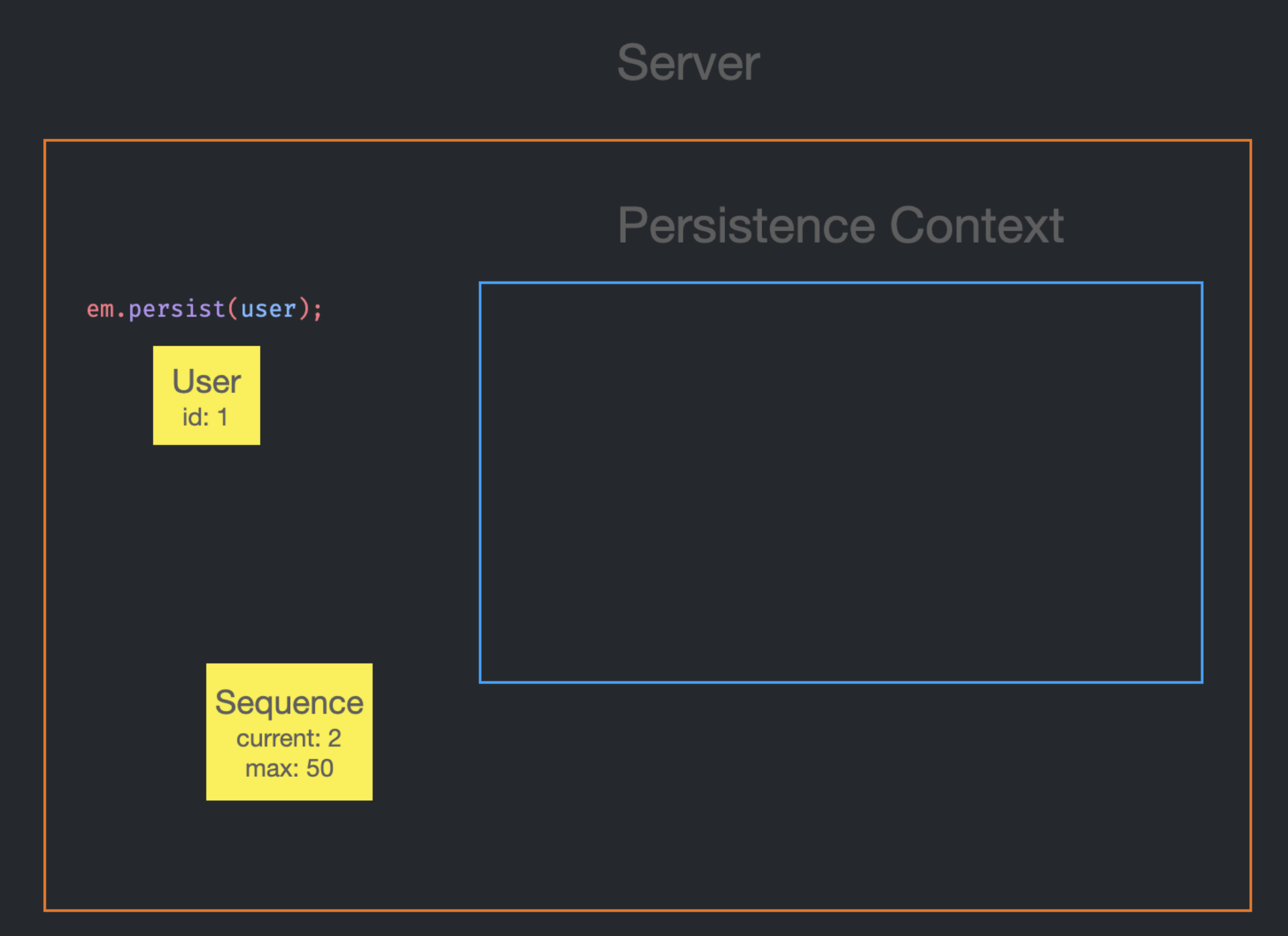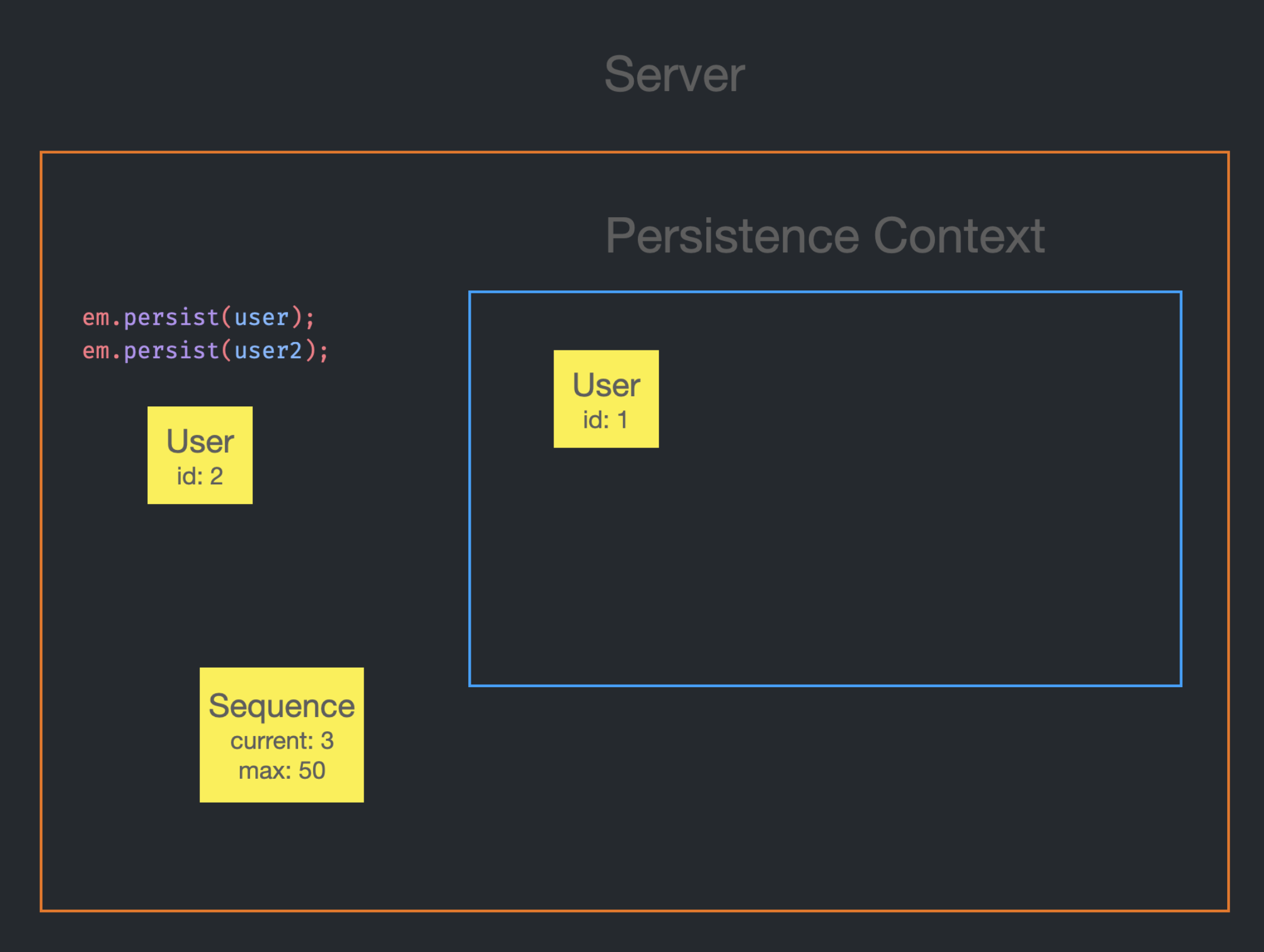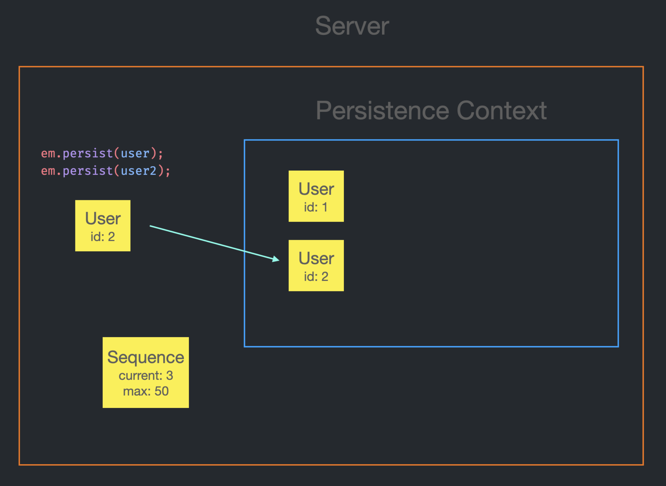 em.persist(user2) 호출 시, user2의 id가 null인 상태였기 때문에 Persistence Context에 들어갈 수 없다. 그래서 sequence에게 currnet인 2를 받아오게 되고, id를 2로 설정한다.